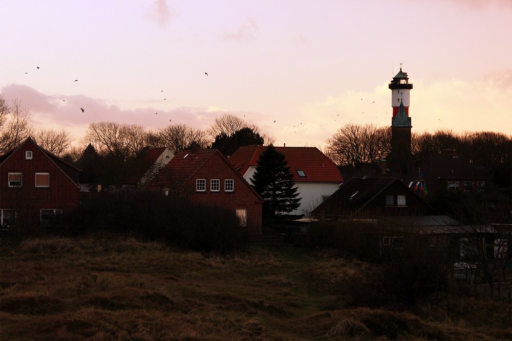 Wir befinden uns hier in den Dünen im östlichen Inseldorf und schauen in Richtung Alter Leuchtturm und Nikolaikirche.
