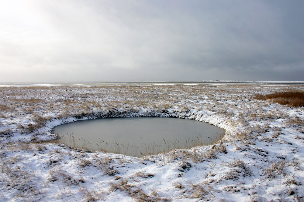 Zeugnisse des II. Weltkriegs sind auch heute noch an vielen Stellen auf der Insel zu erkennen, in den Salzwiesen finden sich beispielsweise gleich mehrere kreisrunde, wassergefülte Bombentrichter. Dieses Exemplar wurde vom Zug aus abgelichtet.