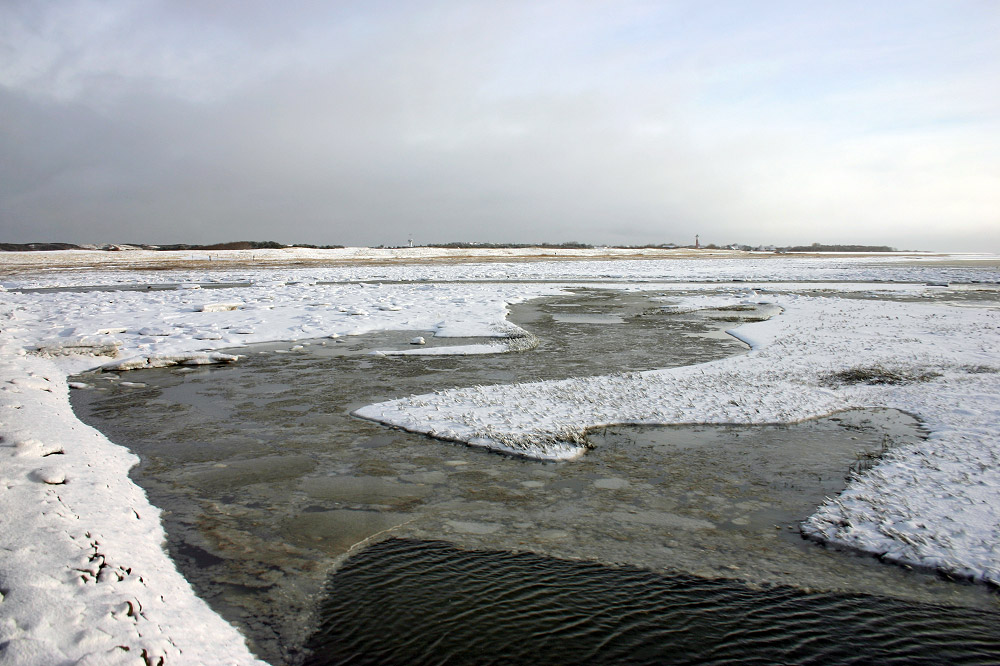 Ein weiterer Blick auf die »Aalkuhlen«. Die Salzwiesen sind von Schnee und Eis bedeckt, doch das Wasser steigt langsam und läßt zumindest den Schnee langsam schmelzen.