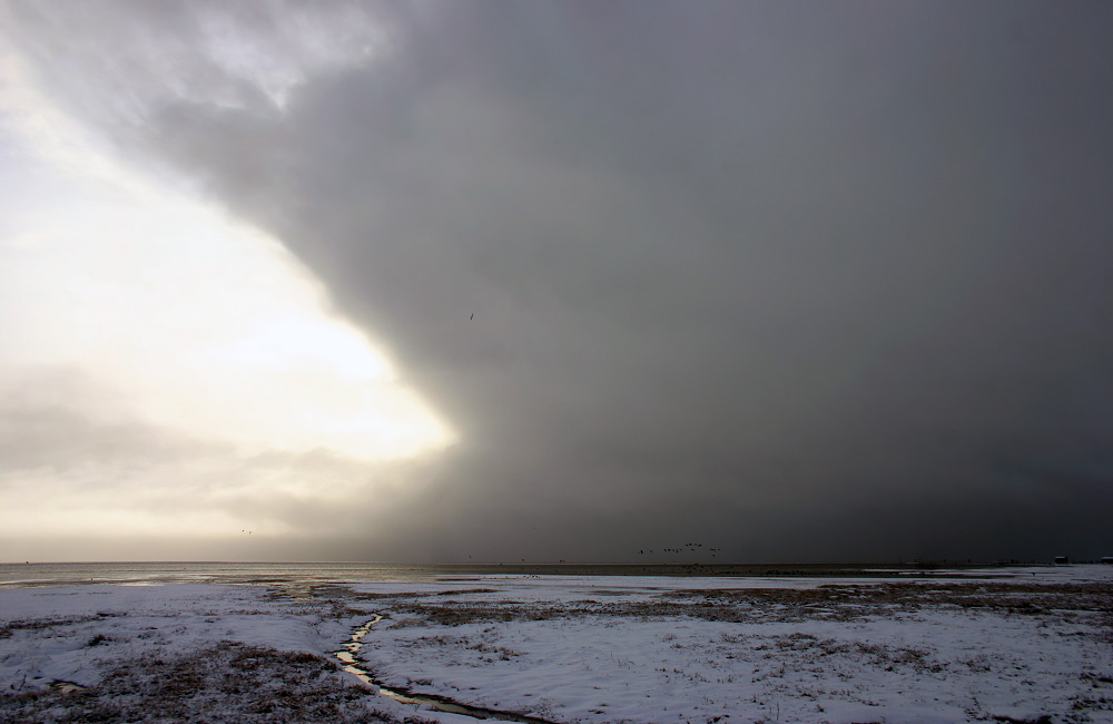 Der Himmel verdunkelt sich, Schneewolken sind im Anmarsch. Gleich wird ein neuerlicher Schneeschauer über der Insel niedergehen.