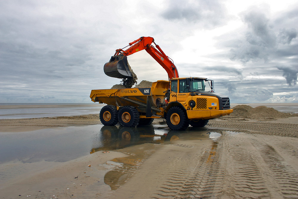 Dies ist die letzte mit Sand gefüllte Baggerschaufel, ein kurzes Hupen signalisiert dem Fahrer, dass er sich auf den Weg zurück zum Hauptstrand machen kann.