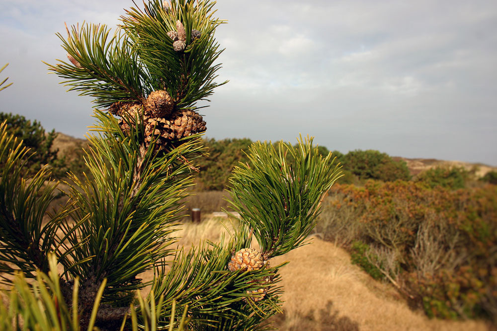 Auf den kargen Böden der Brandünen gedeiht nicht allzu viel, doch Kiefern kommen ganz gut zurecht, ebenso wie die Kartoffelrosen im Hintergrund.