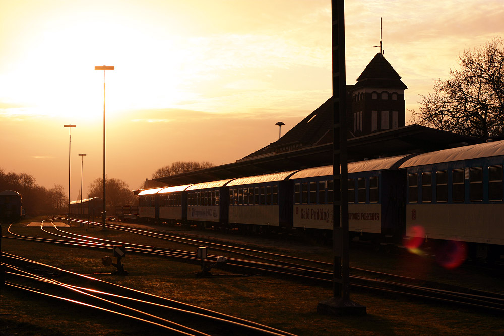Am Bahnhof herrscht an diesem herrlichen Märzabend Betriebsruhe, die tiefstehende Sonne spiegelt sich in den blanken Gleisen und kaum ein Lüftchen regt sich.