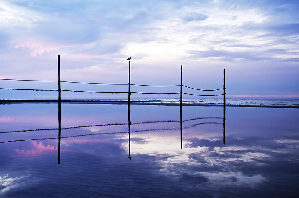 Der Priel liegt so still da, daß man nicht einmal erkennen kann, wo die Pfähle beginnen, die das Badefeld begrenzen. Herrschte an diesem Abend nicht eine wunderbare Abendstimmung?