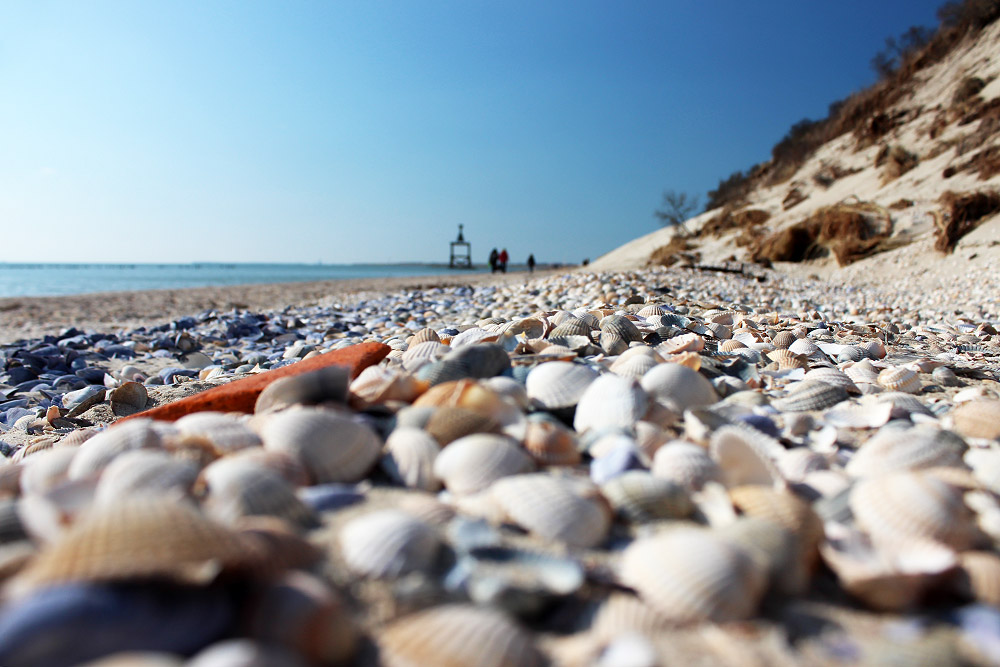 Südlich der hintersten Ostdünen (rechts im Bild) sind abertausende von Muschelschalen zu finden, sowohl von Herzmuscheln als auch von Miesmuscheln oder anderen.