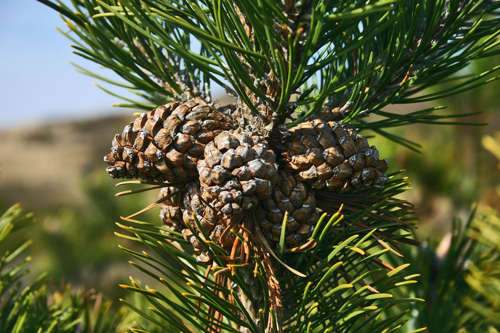 Hier eine Nahaufnahme einiger Kiefernzapfen, umrahmt von langen Nadeln, die charakteristisch für die Kiefer sind.