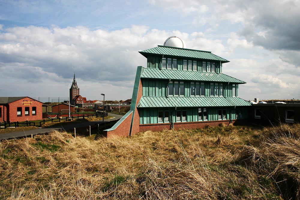 Wir haben das Deckwerk verlassen, nun geht's weiter in Richtung Westdorf. Vorn ist das »Inselheim Rüstringen« zu sehen, das u. a. eine moderne Sternwarte beherbergt.