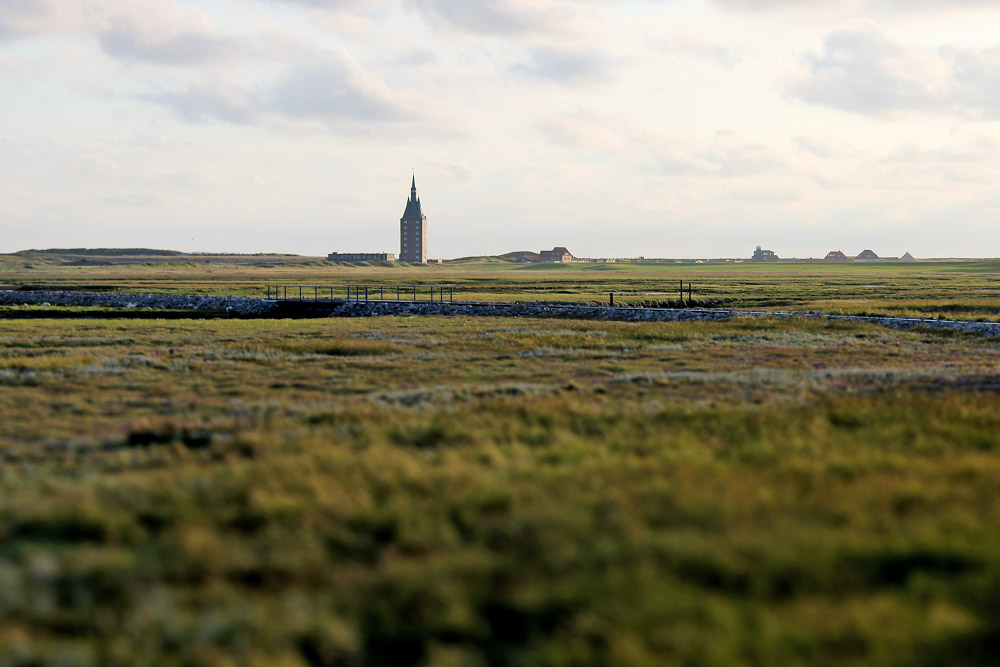 Zwischen dem Aufnahmestandort und dem Westdorf mit Westturm erstreckt sich eine riesige Salzwiesenlandschaft, nur durchbrochen von den Gleisen der Inselbahn. Unter anderem aufgrund dieser beeindruckenden Landschaften erhielt das Wattenmeer an der niederländischen, dänischen und deutschen Nordseeküste das Prädikat »UNESCO Weltnaturerbe«.
