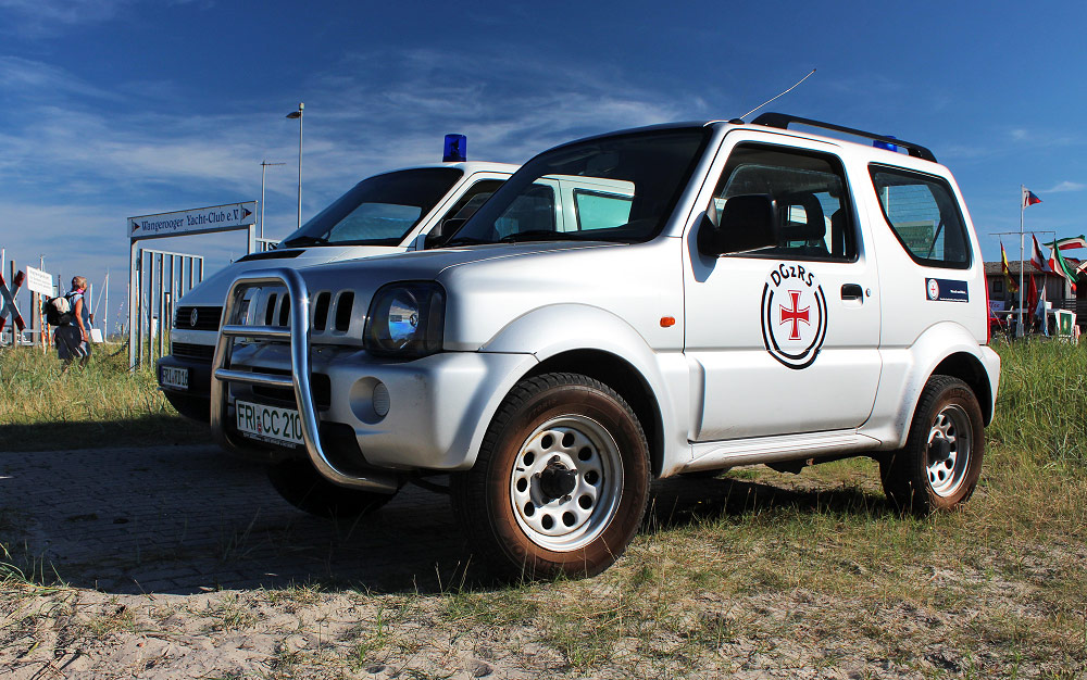 Zwei Dienstfahrzeuge parken am Westanleger: Zum einen der Suzuki Jimny Geländewagen der »Deutschen Gesellschaft zur Rettung Schiffbrüchiger«, zum anderen ein Volkswagen T4 vom »Rettungsdienst Friesland«.