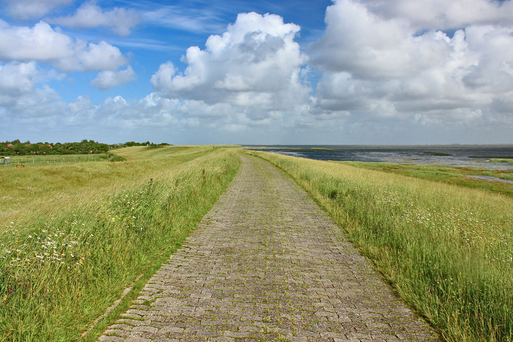 Dieser Teil des Dorfgrodendeichs ist erst nach der Sturmflut von 1962 erbaut worden, vorher bog er in Richtung Bahnhofsteiche ab und war deutlich niedriger. Links sehen Sie einen kleinen Teil des ehemaligen Dorfgrodendeiches.