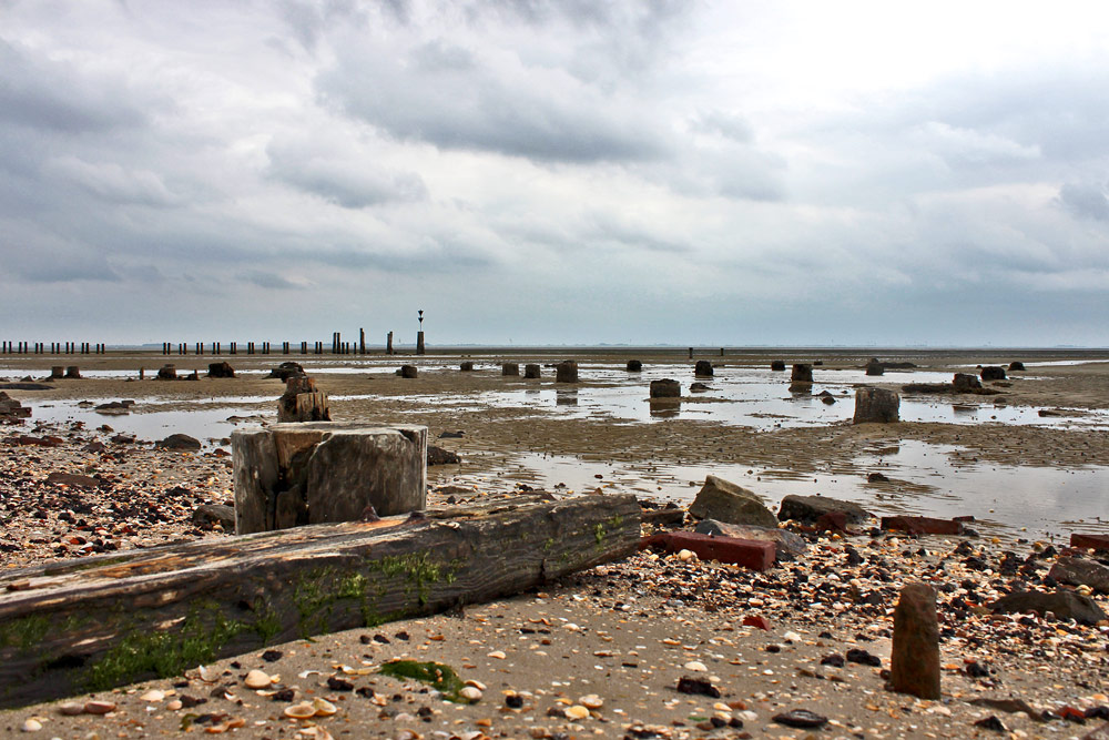 Dort, wo einige Wochen zuvor noch die Ostbake stand, befindet sich nun nur noch ein kleines kardinales Seezeichen. Im Vordergrund sehen Sie übrigens die Pfahlreste der ehemaligen »Schlengenbuden« sowie eine alte Bahnschwelle der Strecke zum Ostanleger.