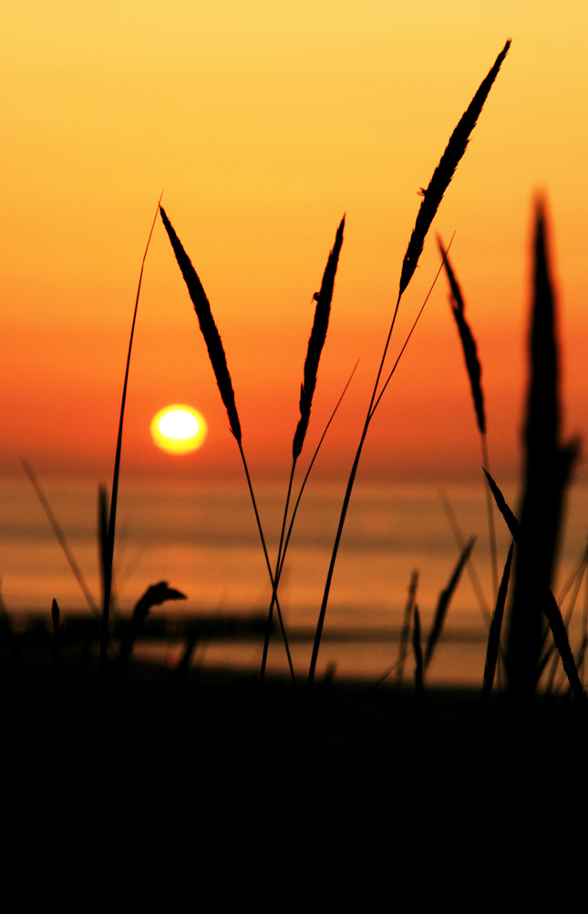 ‹ Durch die charakteristischen Blütenstände ist der Strandhafer im Vordergrund auch anhand seiner Umrisse klar zu erkennen. Im Hintergrund versinkt gerade die Sonne im Meer.