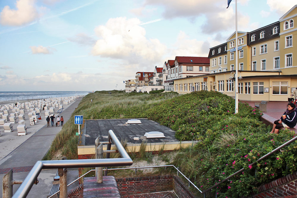 Nur wenige Meter unterhalb all dieser Gebäude befinden sich die Strandmauer und die Strandkörbe des Mittelfeldes; Wangerooge wird von vielen Gästen aufgrund dieser kurzen Wege sehr geschätzt.