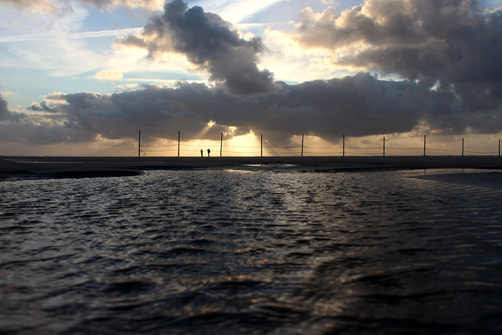 Ein flacher Priel mitten im Hauptbadefeld. Die Wellen sehen allerdings höher aus, als sie sind, in Wirklichkeit beträgt die Wellenhöhe trotz des starken Westwindes nur wenige Zentimeter.
