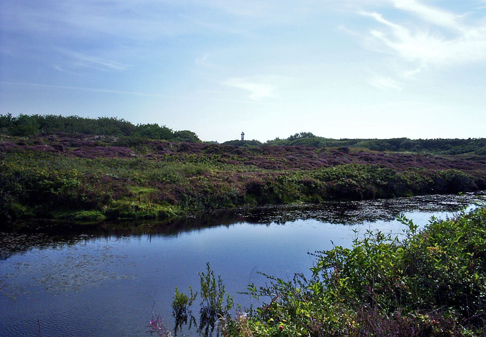 Einige Wasserlöcher sind in den Heidedünen westlich des Inseldorfes zu finden – die sogenannten »Eiskuhlen«. In der Bildmitte sehen Sie außerdem den Alten Leuchtturm, der sich mitten im Dorf befindet.