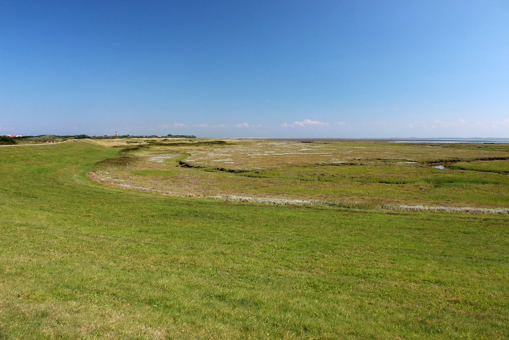 Im Westaußengroden befindet sich eine ausgedehnte Salzwiesenfläche, die von zahlreichen Prielen durchzogen wird. Links und vorn sehen sie den Westgrodendeich, von dem aus auch dieses Bild entstand.