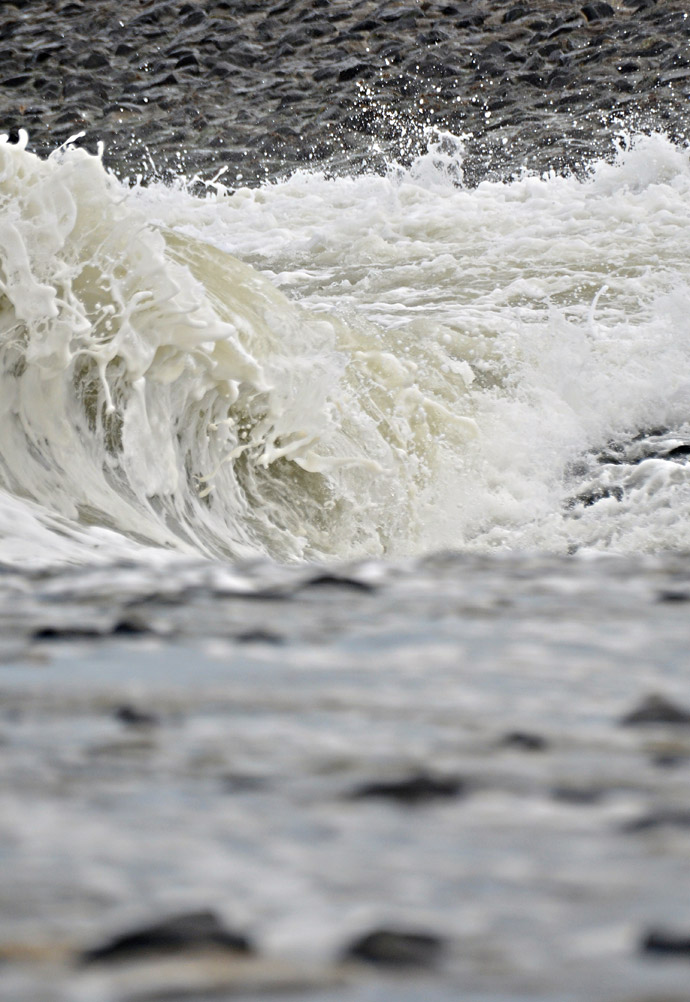 ‹ Die aufgewühlte See hat jede Menge feinen Schaum entstehen lassen, hierdurch sieht das im Foto festgehaltene Meerwasser an einigen Stellen aus wie Milch, eine sehr kurze Belichtungszeit tut dabei ihr Übriges.