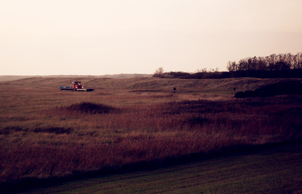 Ein leerer, kurzer Güterzug durchquert die Salzwiesen nahe des Süddeichs. Langsam bricht die Dämmerung über die Insel herein, die Zugscheinwerfer leuchten bereits.