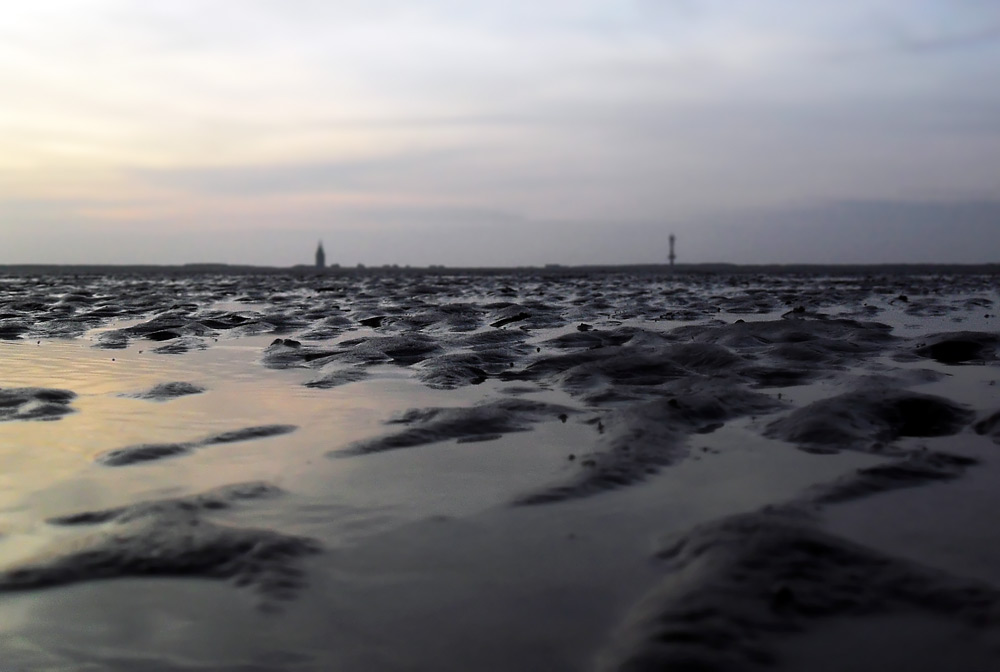 Abendstimmung im Wangerooger Inselwatt bei Niedrigwasser. Zwischen den Sandrippeln ist jede Menge Meerwasser zurück geblieben, was den Weg zum Muschelfeld zu einer nassen Angelegenheit macht. Im Hintergrund sehen Sie den Westturm und den Neuen Leuchtturm.