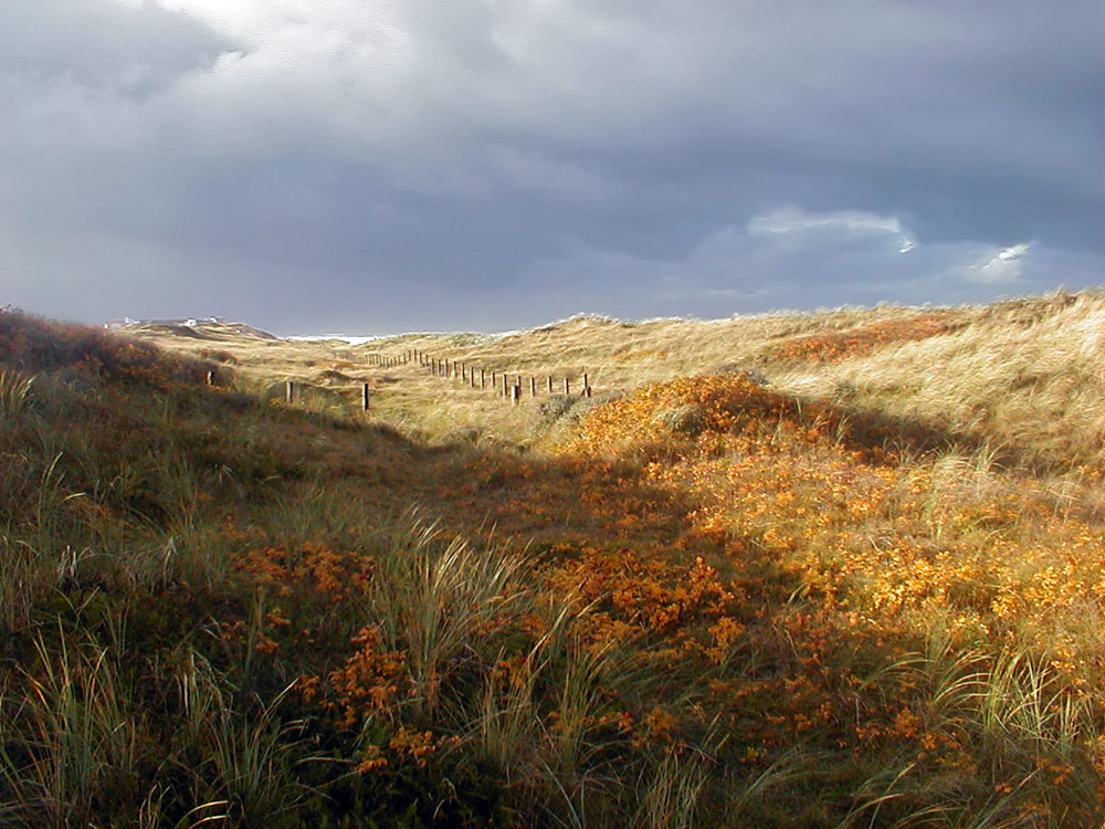 Dunkle Sturmwolken ziehen auf und verstärken den Kontrast zwischen den goldgelben Dünen und dem dunklen Himmel.