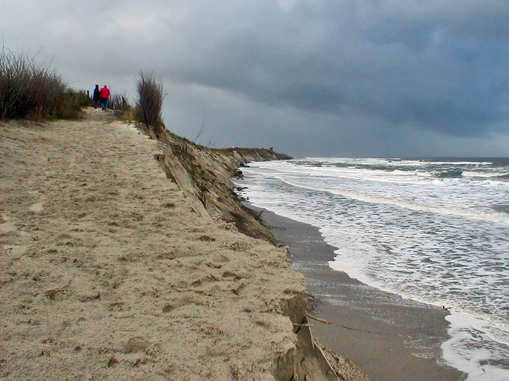 Wir stehen auf der Dünenüberwegung und blicken nach Westen. Die Dünen östlich des Dorfes sind besonders von Abbrüchen betroffen, auch an diesem Tag branden die Wellen wieder gegen den Dünenfuß.