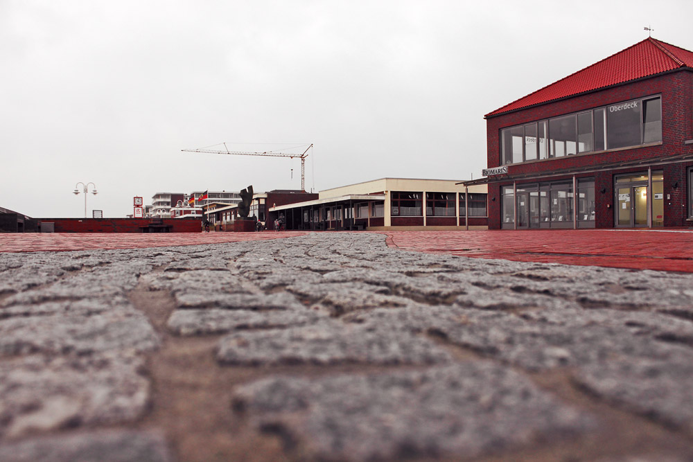 Unter uns das Granitpflaster auf dem »Platz am Meer«, rechts das Servicegebäude der Kurverwaltung.