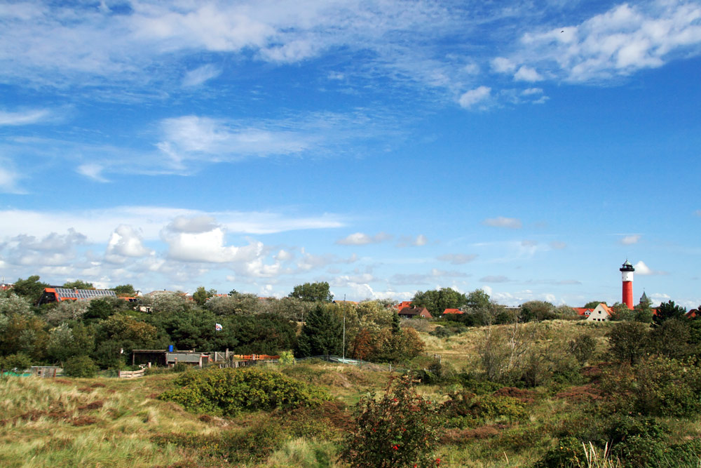 Von einer Düne aus blicken wir hinab auf den »Erlengrund« sowie die dahinter liegenden »Osterdünen«. Im Mittelgrund sind einige Kleingärten zu entdecken, darüber ein herrlicher, blauer Himmel, der nur von ein paar Wölkchen geziert wird.