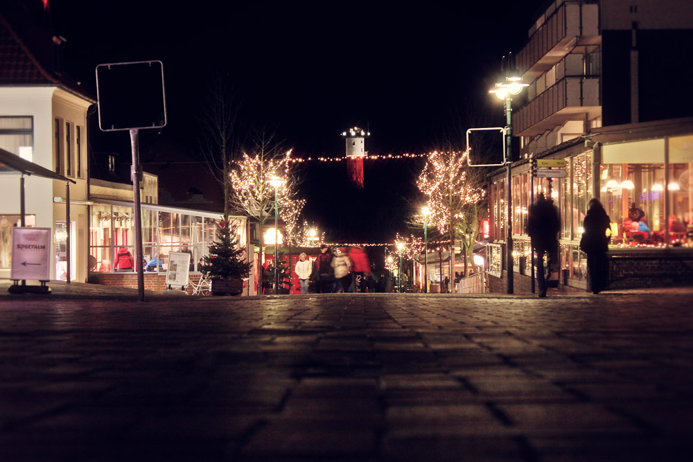 Wir sind die »Zedeliusstraße« hinauf gegangen und haben uns noch einmal umgedreht. Die Straßenbäume sind festlich beleuchtet und im Hintergrund thront der Alte Leuchtturm über dem Inseldorf.