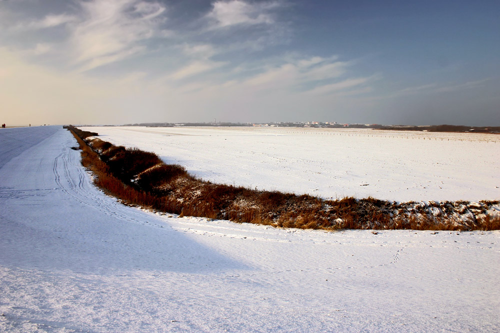 Viel Schnee fiel Ende Dezember 2005 auf Wangerooge. Der gesamte Ostgroden ist weiß, nur entlang des Deichgrabens hebt sich der braune Bewuchs ab.