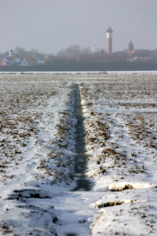 ‹ Ein wahrhaft kalter Wintertag, dieser 30. Dezember 2005. Unser Blick wird von einem Entwässerungsgraben hin zum Inseldorf mit Altem Leuchtturm und Nikolaikirche geleitet. Ganz links sehen Sie außerdem das Bahnhofsgebäude.