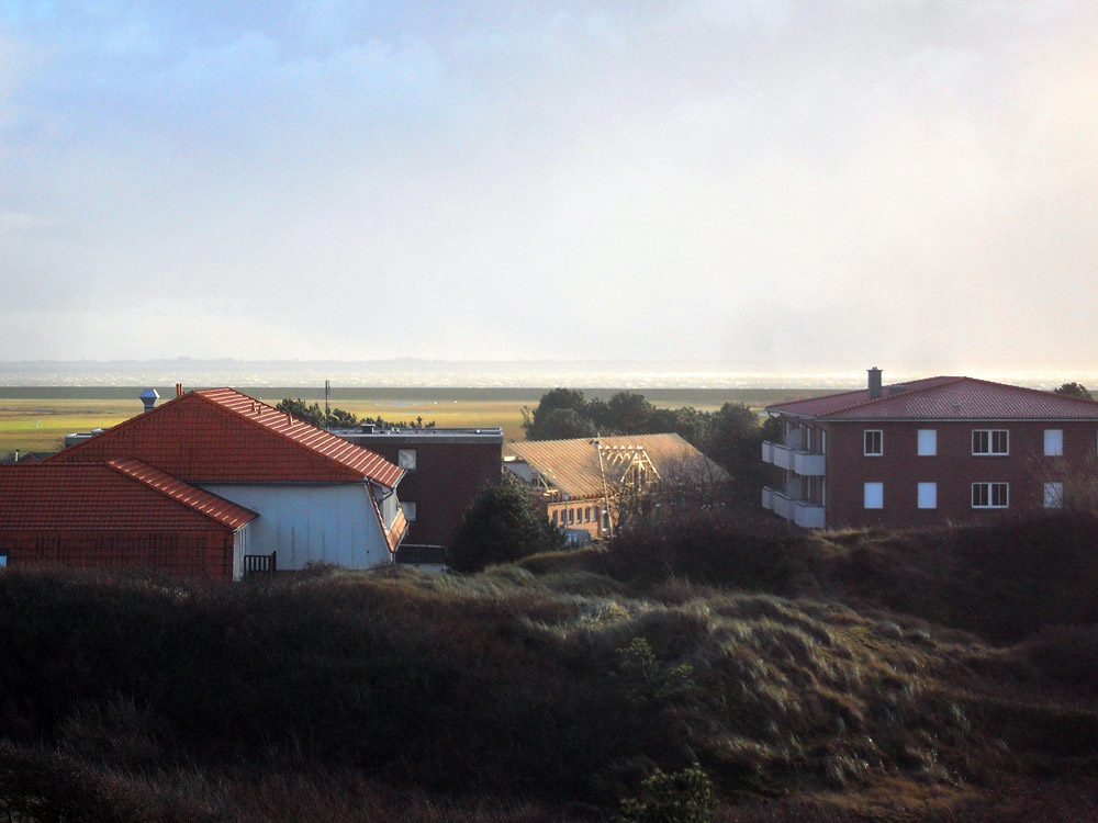 Das »Haus St. Willehad« wurde hier von den Dünen aus aufgenommen. In der Mitte sehen wir ein Gebäude des »Oldenburger Jugenderholungswerks«, das momentan renoviert und umgebaut wird und im Hintergrund ist das Wattenmeer zu erkennen.