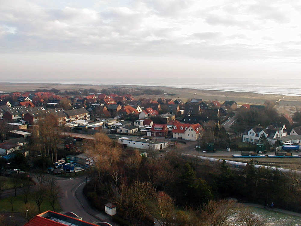 Wir schauen nun vom Alten Leuchtturm aus nach Südosten und sehen vorn den »Hindenburgplatz«, dahinter die Bahngleise und die Wohnbebauung im Dorfgroden. Im Hintergrund schließlich ist das Wattenmeer bei Hochwasser auszumachen.