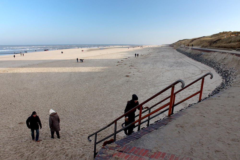 Jetzt, wo der Strand weg ist, kann man ja fast Höhenangst hier oben auf der Strandmauer bekommen. Im Hintergrund sind unzählige schwarze Punkte zu erkennen, der Strand war ein paar Tage vor Silvester von vielen Spaziergängern bevölkert.