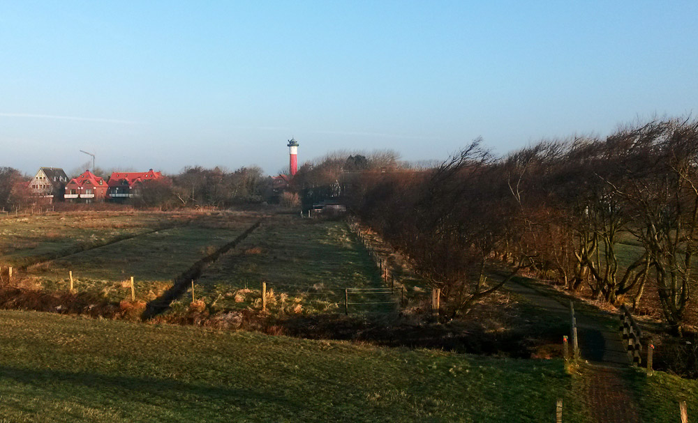 Ein Blick vom Deich aus auf die Pferdeweiden im Dorfgroden sowie den »Fußweg zum Deich«, der von zahlreichen windschiefen Bäumen gesäumt wird.