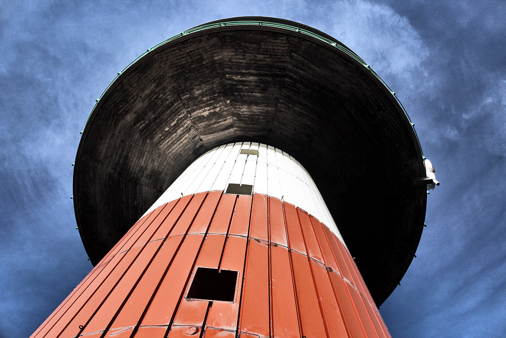 Wir stehen hier direkt vor der Südseite des Neuen Leuchtturms und blicken empor. Das auskragende Mittelgeschoß verdeckt den Blick auf die Turmspitze, in diesem Geschoß befinden sich u. a. das Leit- und das Nebenfeuer.