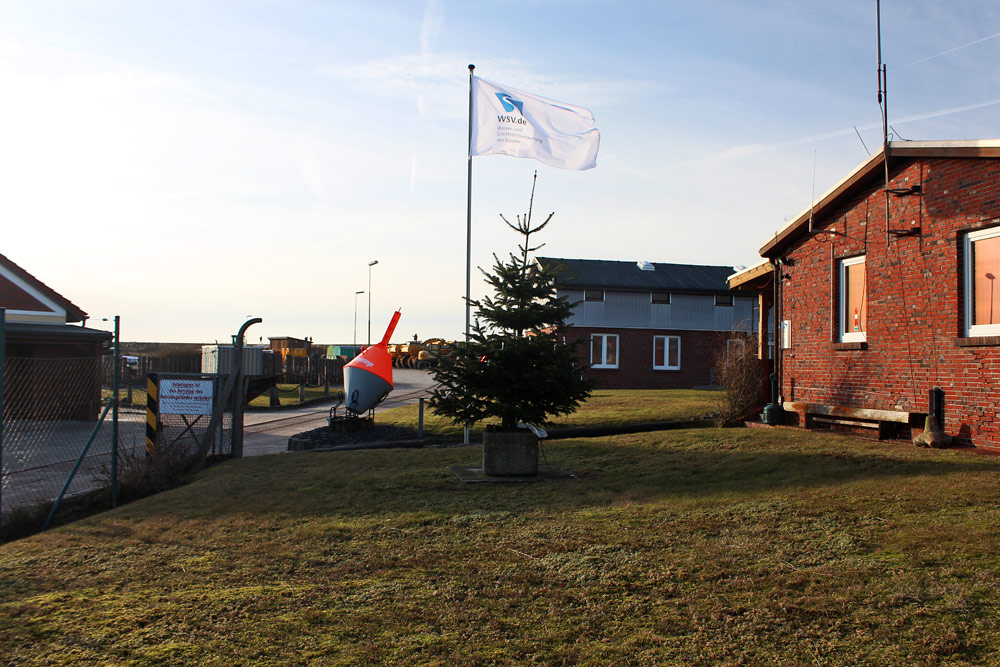 Hier am Westende hat die Wangerooger Außenstelle des »WSA« ihren Bauhof. Eine Backbordtonne säumt die Einfahrt, direkt daneben weht eine Flagge der »Wasser- und Schiffahrtsverwaltung« im frischen Wind.
