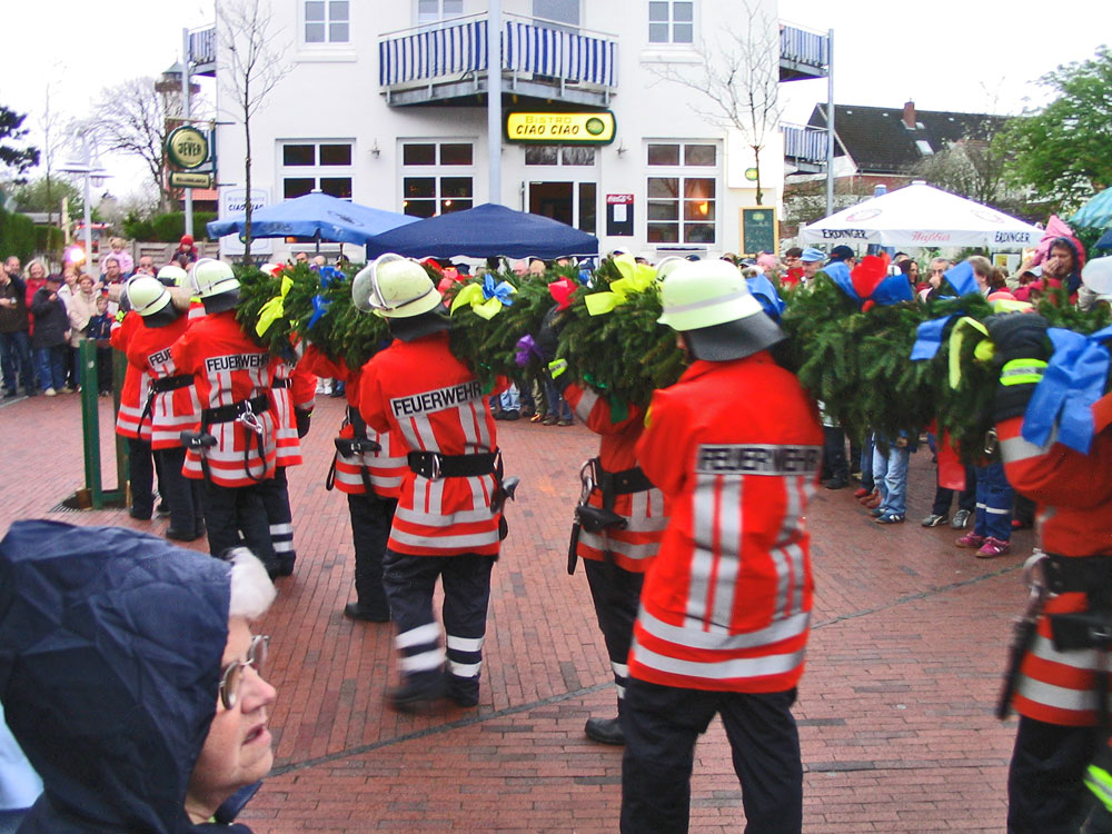 Wie praktisch überall im Nordwesten wird auch auf Wangerooge am 30. April der Maibaum aufgestellt. Hier bringt gerade die Feuerwehr den festlich geschmückten Baum.