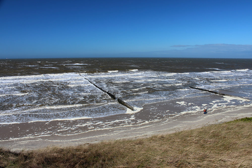 Hier blicken wir von der Aussichtsdüne beim »Bielefelder Heim« hinunter an den Strand. Durch die Brandung wurde viel Schaum an den Strand geworfen.