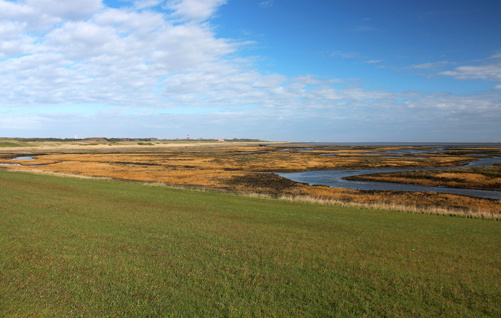 Die Priele im Westaußengroden werden auch »Aalkuhlen« genannt, Aale tummeln sich dort aber kaum noch. Vorn sehen Sie das kurz gemähte Gras des Westgrodendeiches, im Hintergrund ist der Alte Leuchtturm zu erahnen.