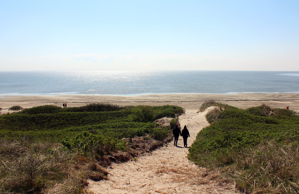 Dieses Paar hat soeben die Dünen überquert und ist nun auf dem Weg in Richtung Wattseite der Insel. In gut einer Stunde wird das Wasser seinen höchsten Stand erreichen, das Watt ist bereits vollgelaufen.