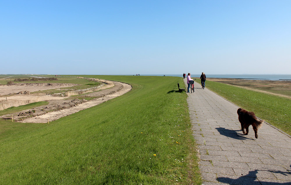 Bei dem guten Wetter lohnt sich ein Spaziergang bzw. eine Spazierfahrt auf den Wangerooger Schutzdeichen. Links entsteht demnächst der neue Deichverteidigungsweg.