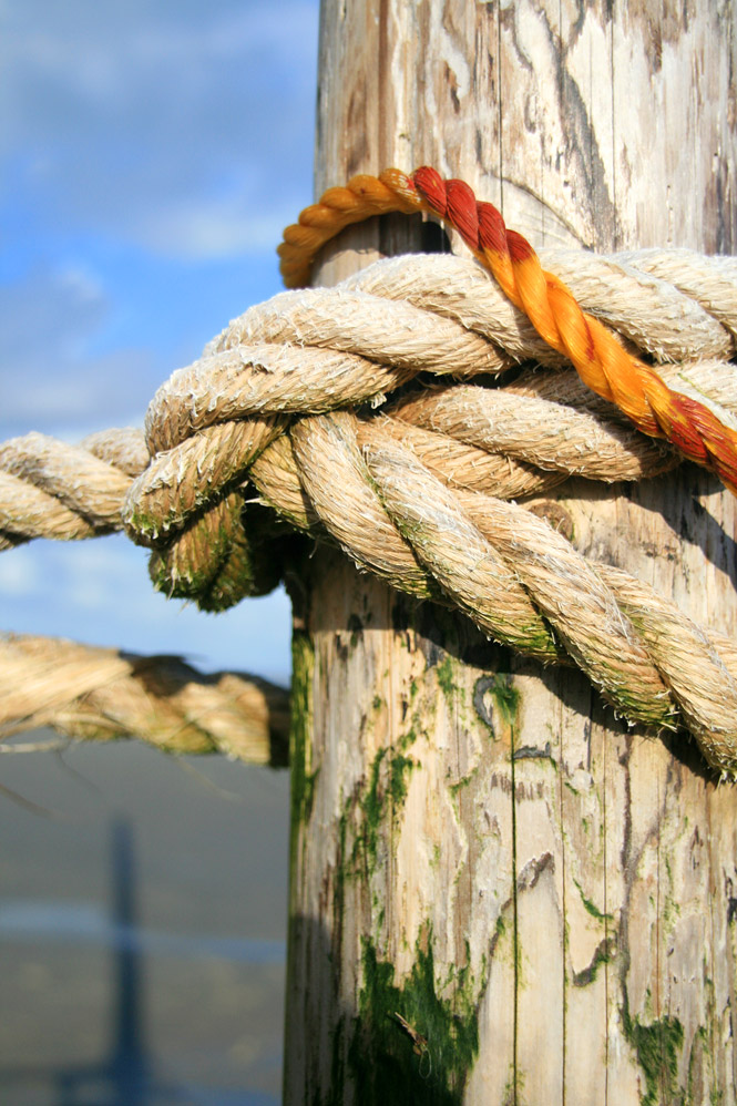 ‹ Fast wie moderne Kunst wirken die dicken Taue, die um die Pfähle der Badefeldbegrenzung gewickelt sind. Ein orange-roter Kunststofftampen hat sich ebenfalls mit ins Bild gemogelt.