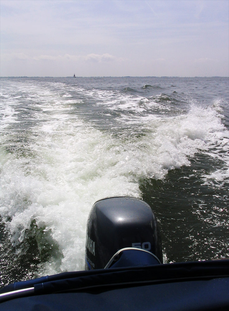 ‹ Ein Blick auf die Hecksee während einer kleinen Bootstour. Ganz entfernt ist das friesische Festland auszumachen.