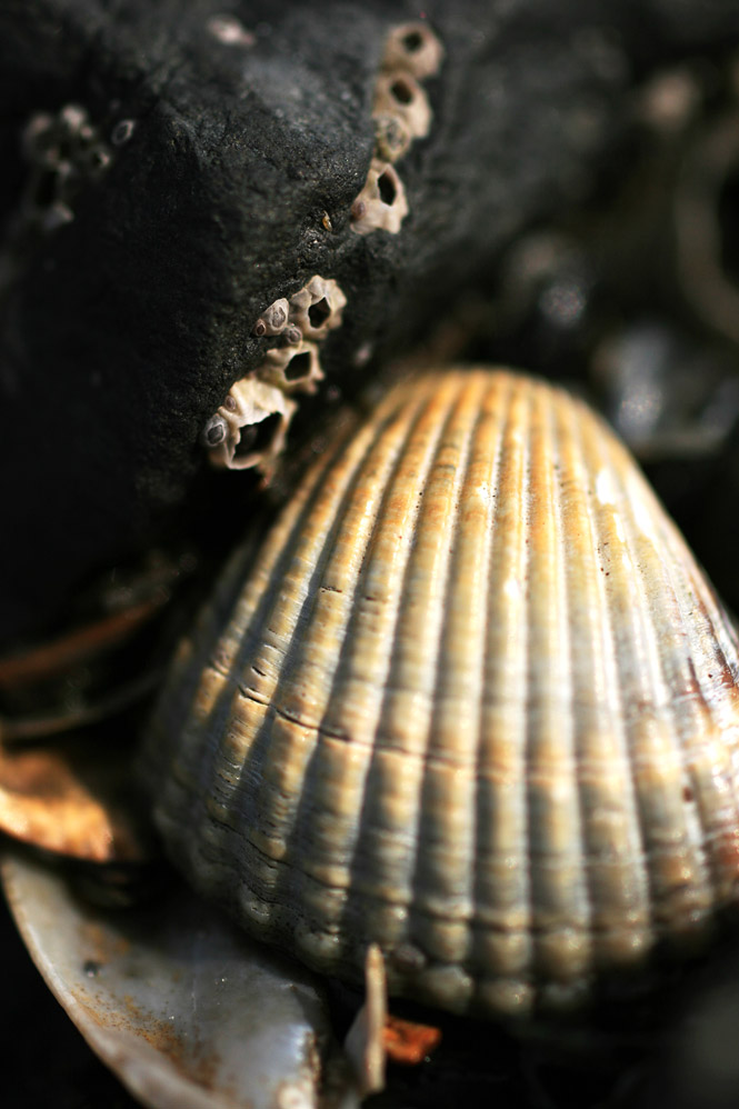 ‹ Eine »Gemeine Herzmuschel« (Cerastoderma edule) an einer Buhne zwischen Seepocken und anderen Muscheln. Schalen der Herzmuscheln findet man an der deutschen Nordseeküste besonders häufig, vor allem natürlich an Buhnen oder dem Spülsaum.