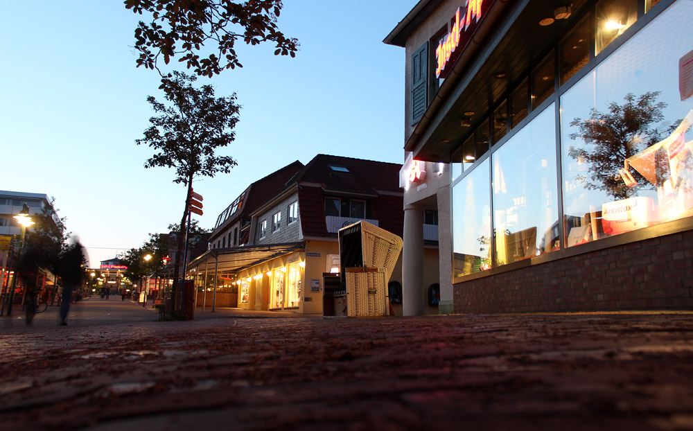 Die Sonne ist seit über einer halben Stunde untergegangen, die Dämmerung bricht über das Dorf hinein. Das Foto entstand in der »Zedeliusstraße«, direkt vor der »Insel-Apotheke«.