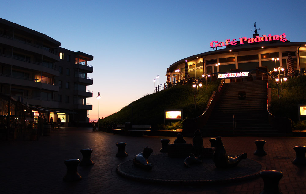 Wir haben die Dorfstraße erklommen und stehen nun vor dem allseits bekannten »Café Pudding«. Vor uns befindet sich eine Skulptur mit Seehunden und spielenden Kindern, links sehen wir das Haus »Monopol«.