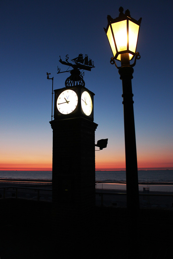 ‹ »Blaue Stunde« an der Uhr nördlich des »Puddings«. Am Himmel ist ein toller Farbverlauf von Rot über Orange und Blaßgelb bis hin zu einem dunklen Blau erkennbar, die Objekte davor heben sich schwarz ab.