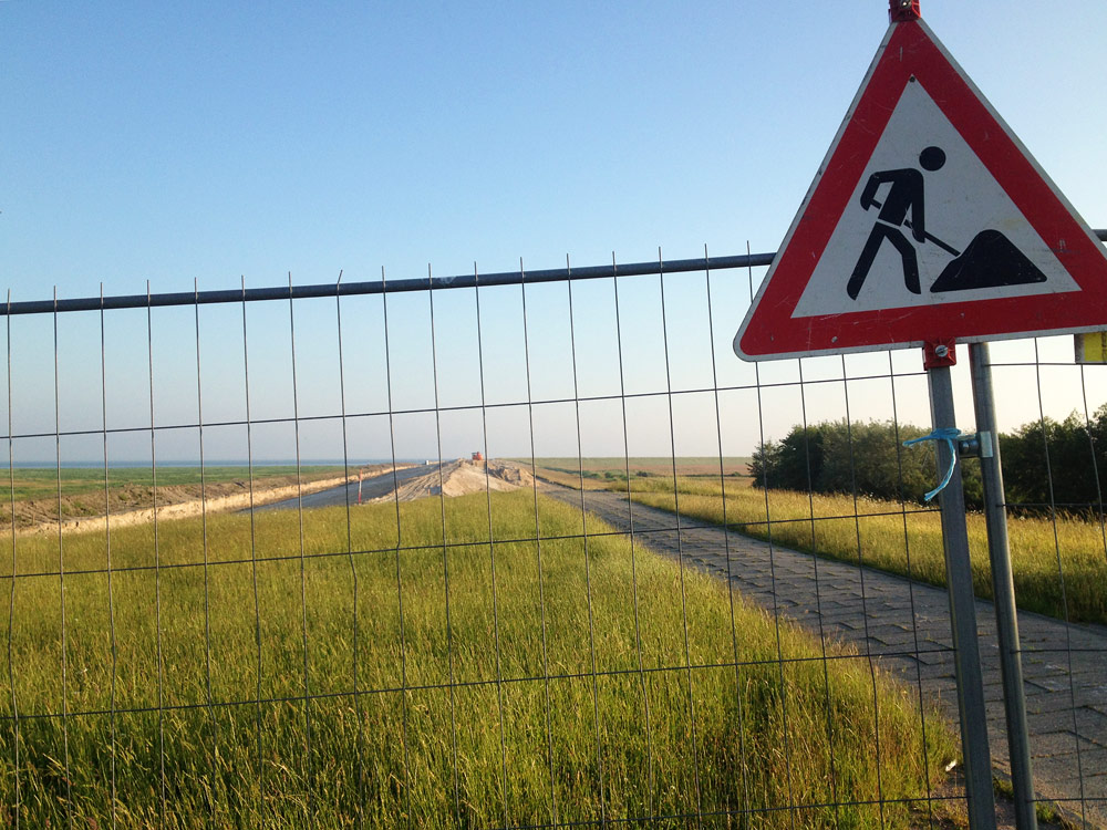 Der Ostgrodendeich ist durch einen Bauzaun inkl. Baustellenschild abgesperrt, im Hintergrund finden die Arbeiten am erhöhten Deichabschnitt statt.