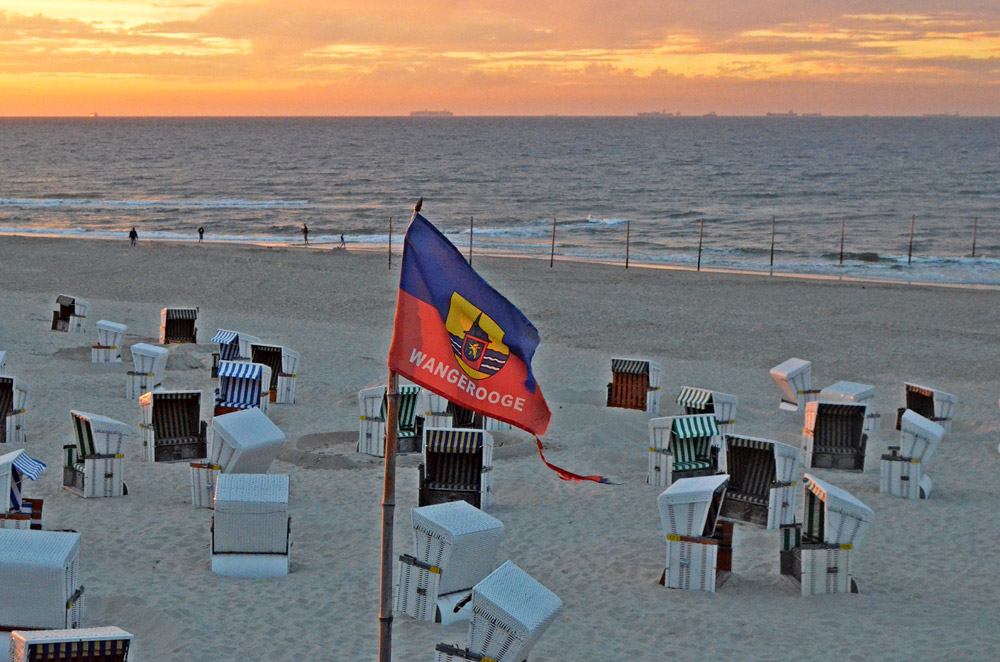 Im Vordergrund sehen wir eine Wangerooge-Flagge, die sich am Mittelfeld-Badekarren befindet, dahinter die Strandkörbe des Westfeldes sowie schwache Brandung bei Hochwasser – es ist nicht besonders windig.