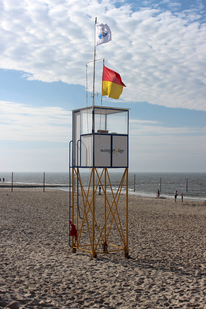 ‹ Der Wangerooger Strand wird seit einigen Jahren von der DLRG betreut, wie man an den am Badeturm gehißten Flaggen erkennt. Hier sehen wir den Hauptbadeturm, von dem aus das Hauptbadefeld unterhalb »Café Pudding« gut zu überblicken ist.